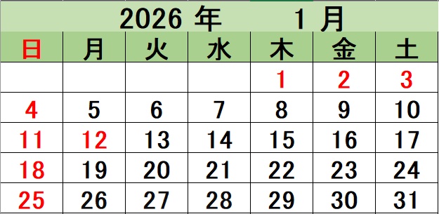 カレンダーは、営業日は黒数字、お休みは赤数字となっております。