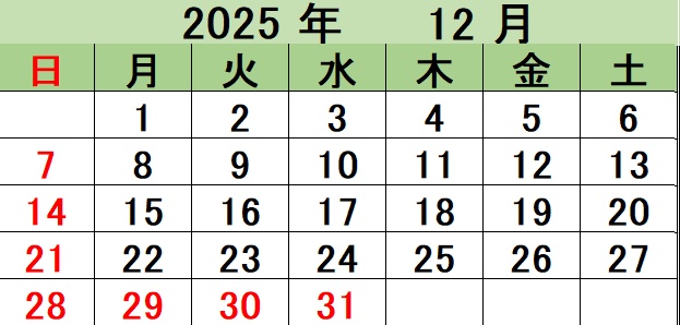 カレンダーは、営業日は黒数字、お休みは赤数字となっております。